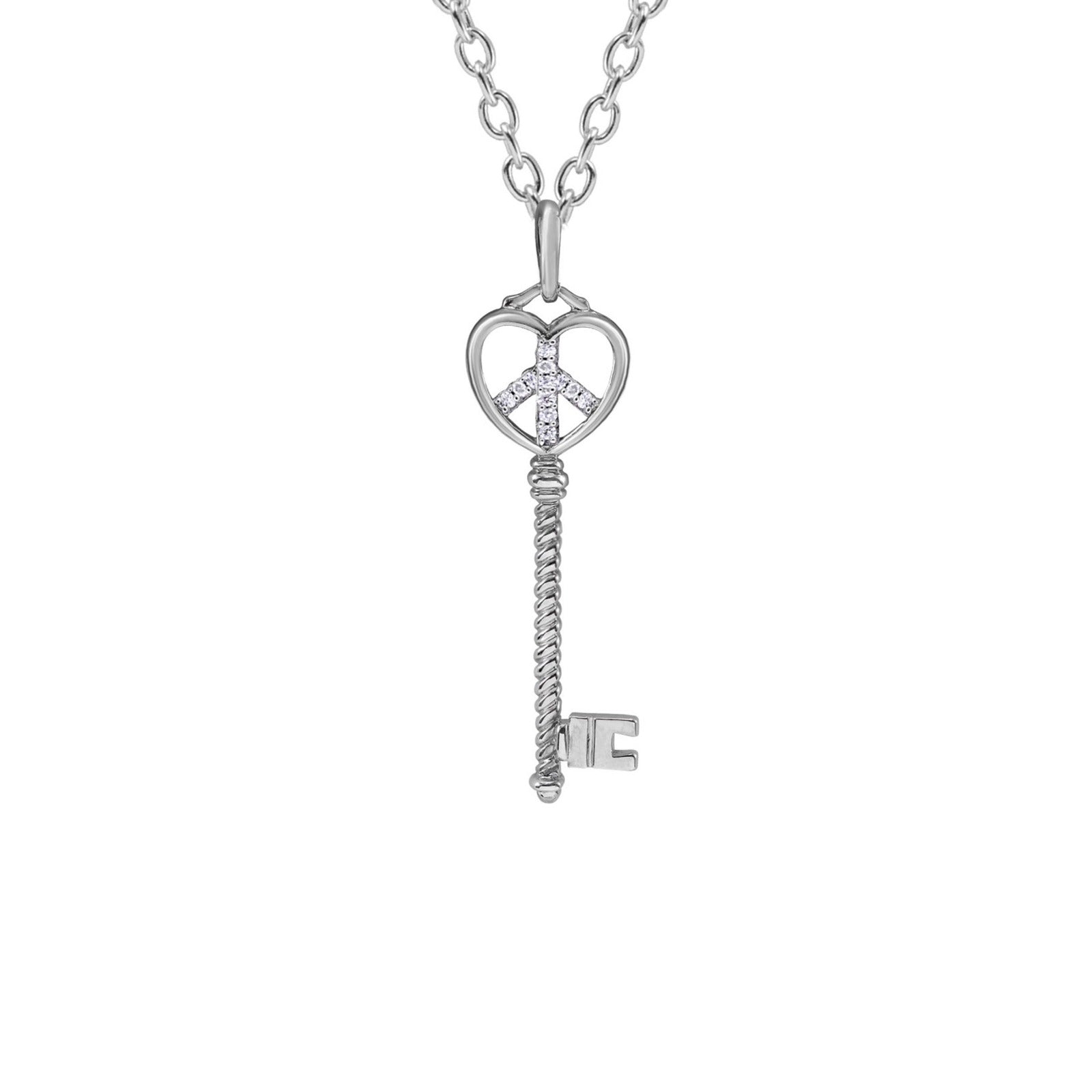 This pendant features a sleek white gold key design with a heart-shaped bow at the top, symbolizing love and peace. Inside the heart is a pavé-set peace sign, adding a meaningful and stylish touch. The twisted shaft of the key gives it a modern, textured look, while the small rectangular key bit completes the classic key silhouette. This pendant combines romantic symbolism, peace, and elegance in one refined piece perfect for everyday wear or as a meaningful gift.