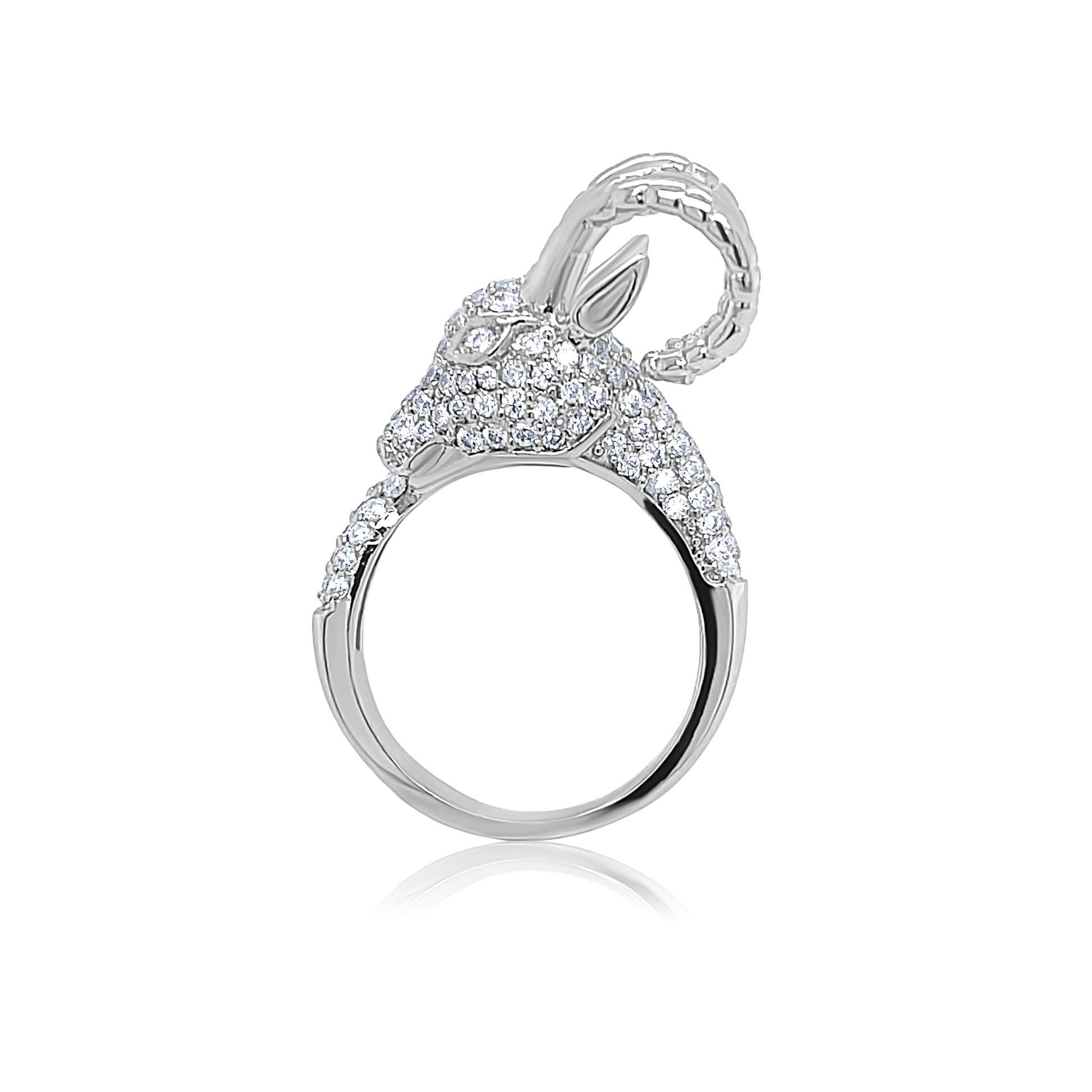 This extraordinary ring showcases a bold and sculptural ram’s head design, intricately crafted in gold. The head, horns, and sweeping body are fully pavé-set with brilliant white diamonds, creating a dazzling, continuous sparkle from every angle. The ram’s curved horns are meticulously textured, adding depth and realism to the piece, while the eyes and facial contours are finely detailed to enhance expression and character. The body of the ram wraps gracefully around the finger in a fluid, open-ended form, blending artistry with luxury. Dramatic, unique, and exquisitely made, this ring stands out as a statement piece of fine craftsmanship and opulent design.
