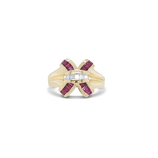 Ignite your style with the "Ruby Embers Glow Gold Ring." Crafted in gold, this channel-set ring features diamonds and a fiery ruby, casting a warm and enchanting glow that symbolizes the embers of passion.