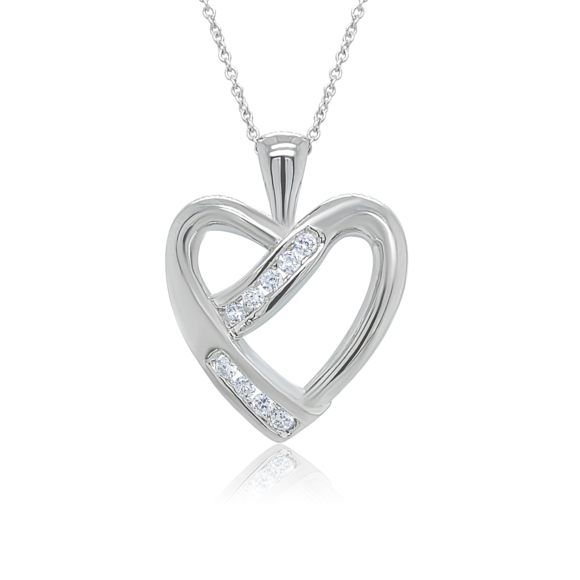 The Heart-Shaped Pendant necklace made of what appears to be silver or white gold. The pendant features a sleek and modern open-heart design with two curved, crisscrossing metal bands. These bands are adorned with small, sparkling gemstones, adding elegance and brilliance to the piece. The pendant hangs from a delicate chain, likely matching the metal of the pendant. The overall design is stylish and timeless, making it a beautiful piece of jewelry for everyday wear or special occasions.