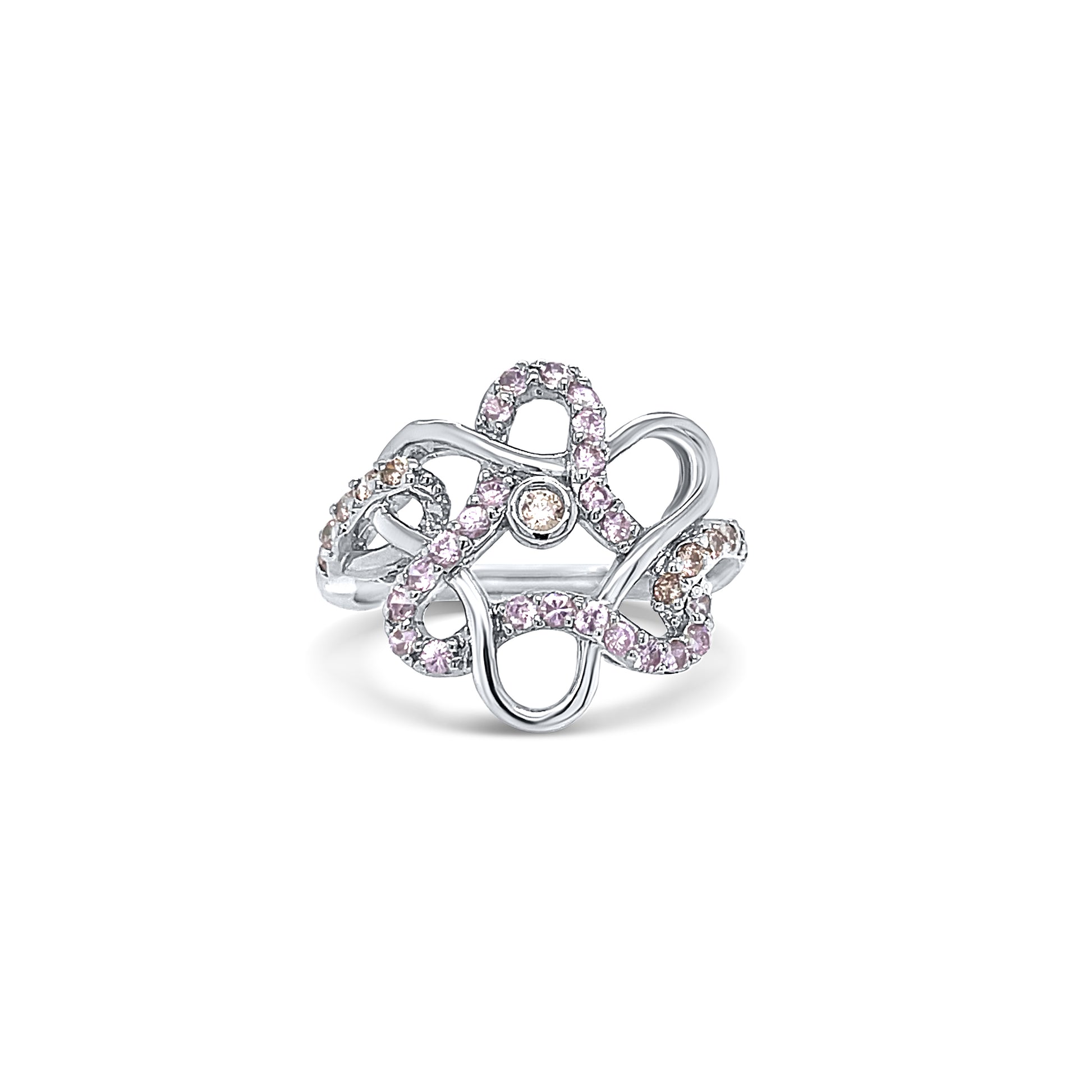 The image features an elegant silver ring with an intricate, looping design. The ring is adorned with small pink gemstones, arranged along the curved metal framework, giving it a delicate and feminine appearance. A central round diamond or gemstone is bezel-set at the middle, adding a focal point to the design. The ring’s openwork structure creates a lightweight yet striking aesthetic, making it a unique and artistic statement piece.