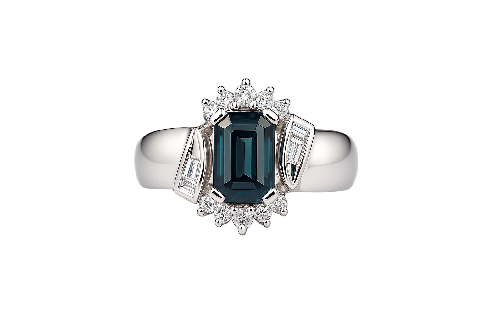 This ring features a black emerald-cut center stone set vertically in a four-prong setting, displaying a rich teal-blue color that adds bold elegance to the design. Surrounding the gemstone is a mixed halo of diamonds, with round brilliant diamonds forming a soft crown-like cluster at the top and bottom, and tapered baguette diamonds positioned on each side to create a sleek, structured look. The band is crafted in high-polished white gold with a wide, smooth shank that adds weight and luxury, perfectly balancing the detailed, sparkling center arrangement.