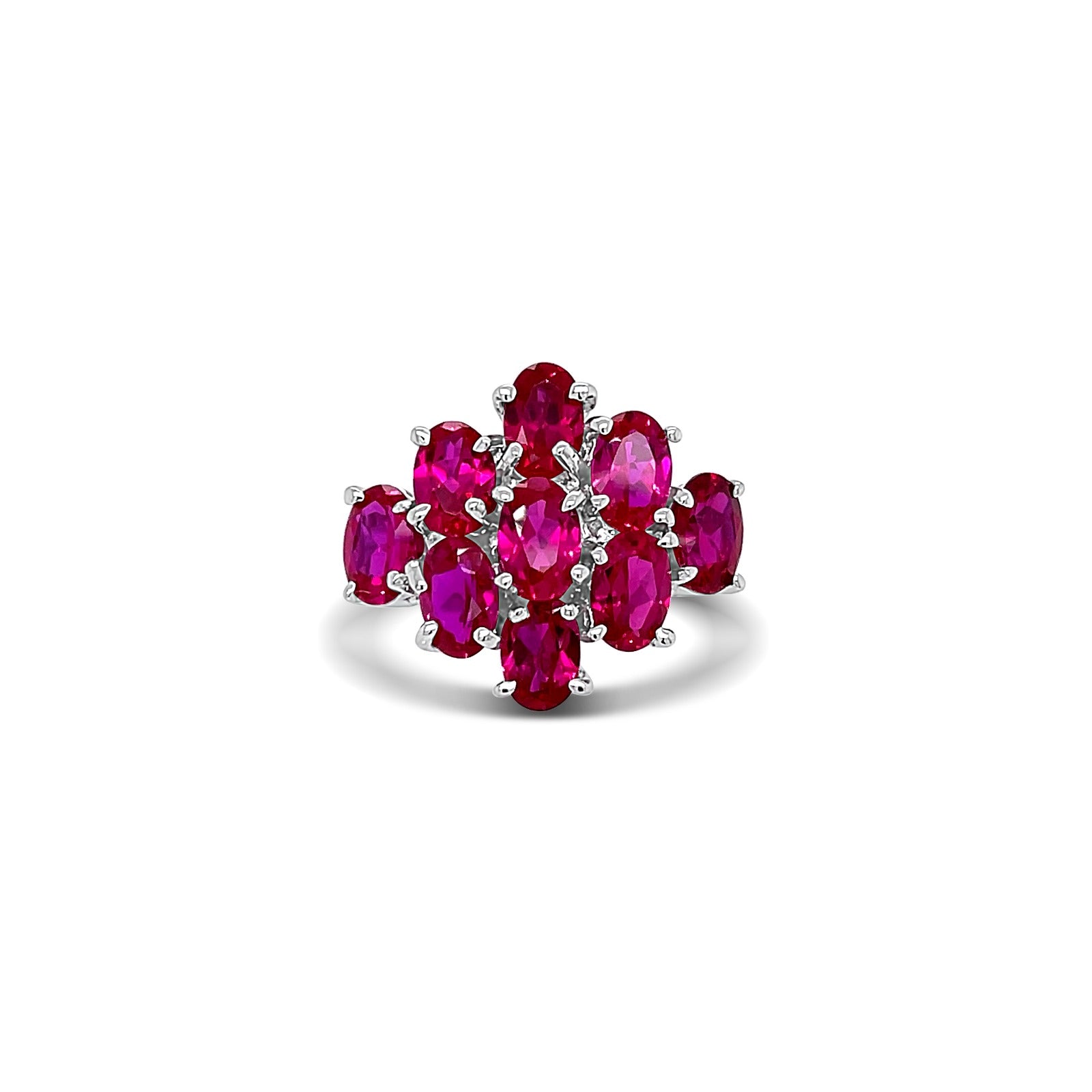 This striking cluster ring features a dramatic arrangement of vivid oval-cut rubies, set in a radiant floral-inspired formation. Each ruby displays a rich, deep pinkish-red hue and is secured with polished white-gold prongs that enhance the brilliance of the stones. At the center, delicate round white diamonds add a sparkling focal point, creating contrast and elevating the overall design. The wide, dimensional cluster shape gives the ring a bold, luxurious presence, making it an eye-catching statement piece full of elegance and vibrant color.