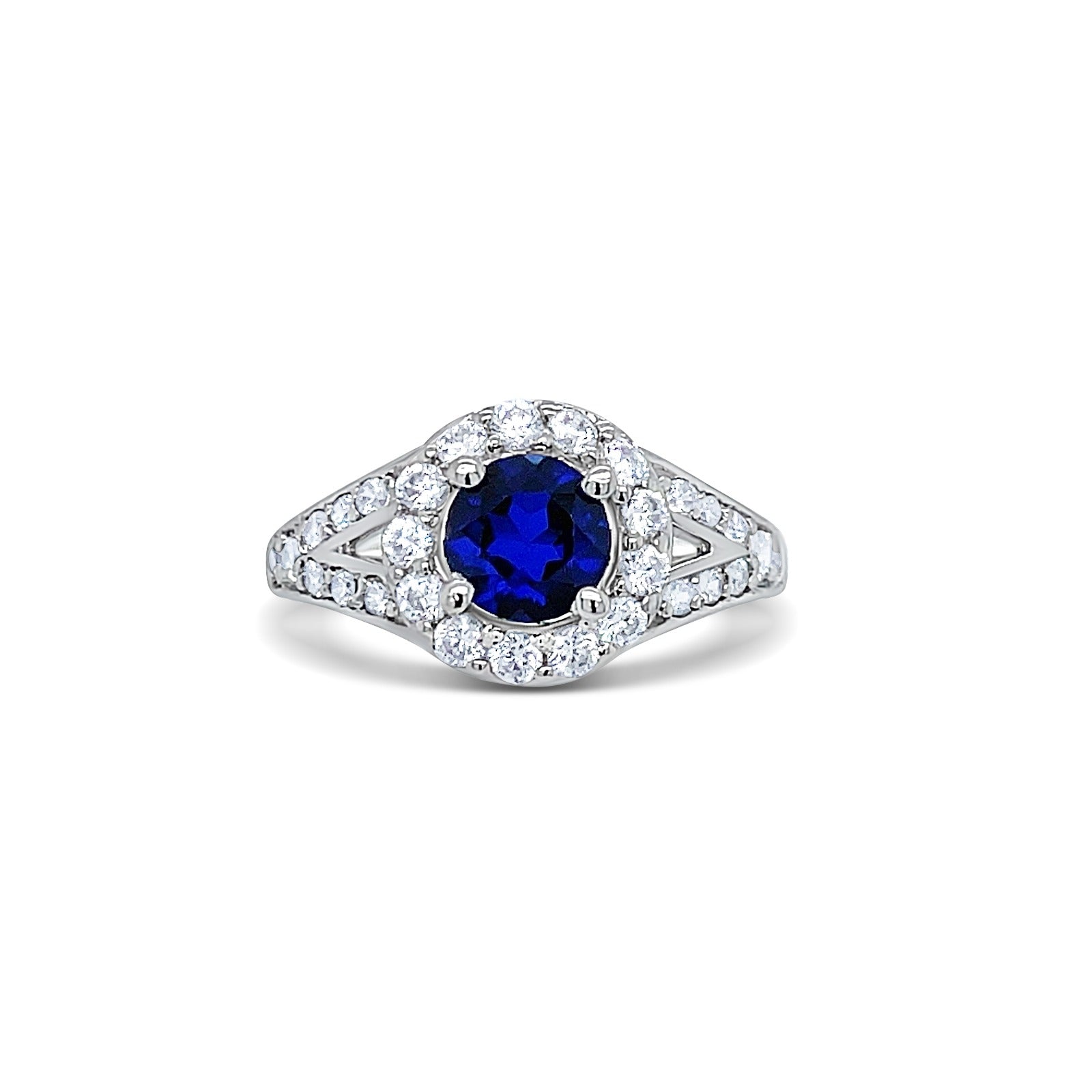 An elegant ring made of white gold. At its center is a round blue sapphire secured by four prongs. Surrounding the sapphire is a halo of smaller white diamonds, which enhance the brilliance and contrast of the central gem. The band features a split-shank design, also encrusted with small diamonds, adding extra sparkle and sophistication. Overall, the ring has a luxurious and timeless appearance, combining classic elegance with intricate detailing.