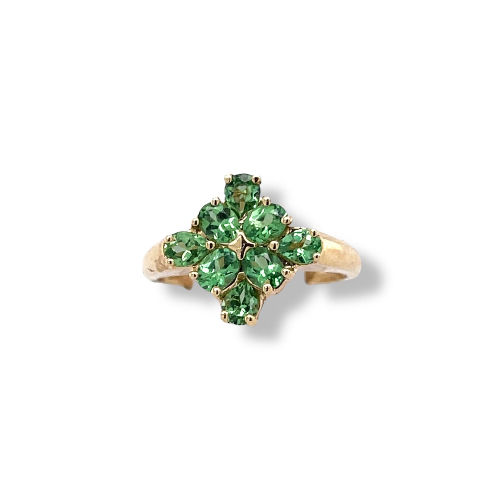 A gold ring featuring several bright tsavorite gemstones, arranged in a floral or star-like cluster pattern. The stones are round-cut and set closely together, forming a symmetrical design that radiates from the center. The gold band is simple and elegant, allowing the vivid green gemstones to stand out as the focal point of the ring. The overall appearance is classic, elegant, and eye-catching.