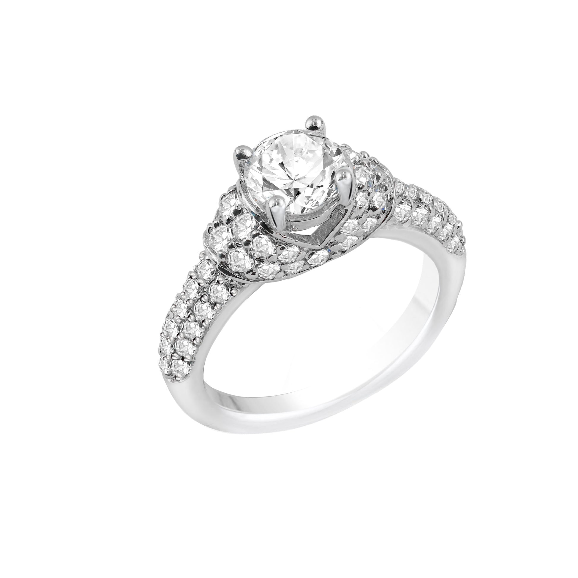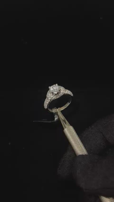 Shinny ring featuring a round-cut center diamond held in a prong setting. The band is adorned with multiple smaller diamonds, creating a pave or halo design, adding extra sparkle.