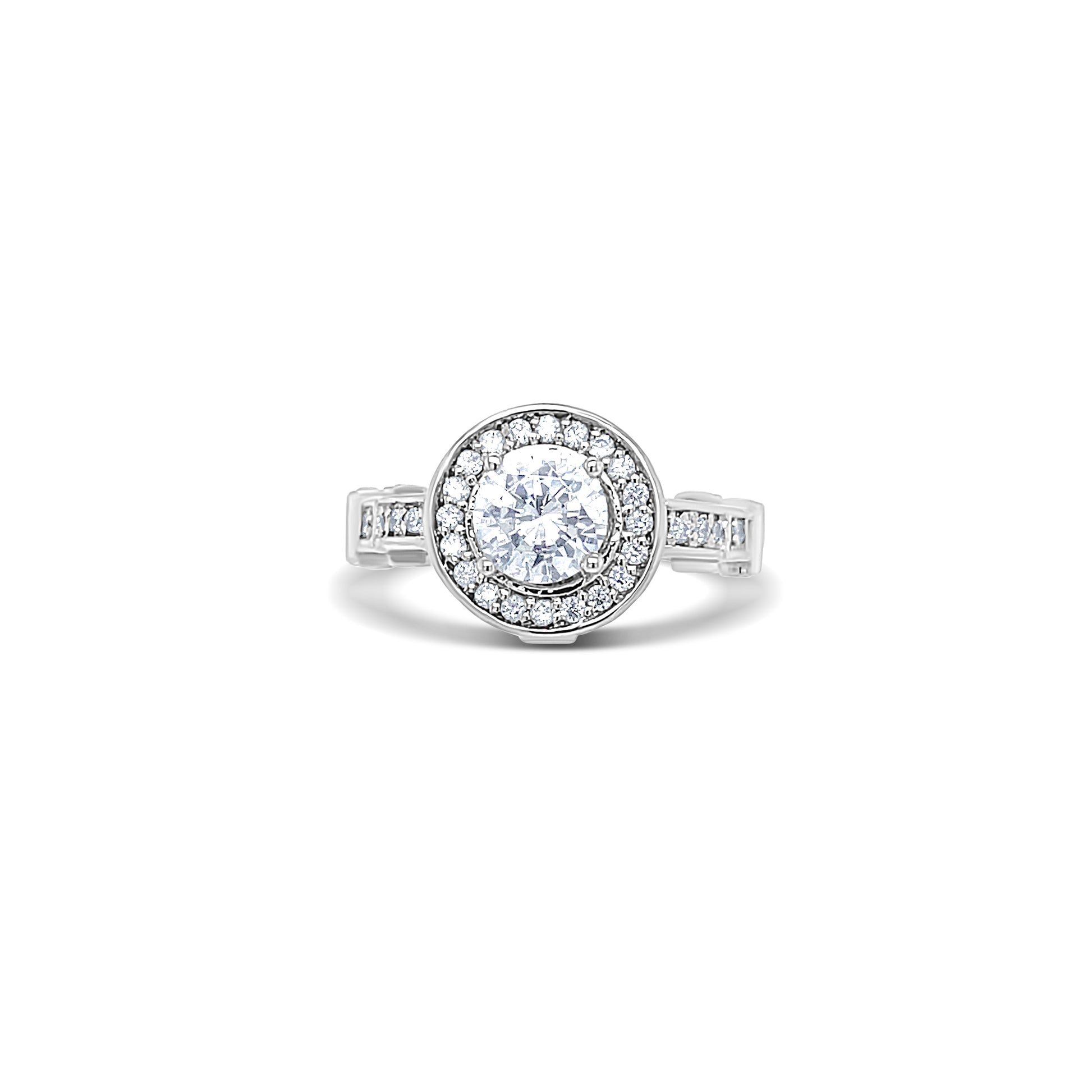 A stunning white gold or platinum engagement ring featuring a round-cut center diamond set within a bezel setting. Surrounding the center stone is a halo of smaller diamonds, enhancing its brilliance and giving the ring a timeless and elegant appeal. The band is adorned with channel-set square-cut diamonds, adding a sophisticated and structured look to the design. This ring beautifully combines modern and vintage elements, making it a perfect choice for those who appreciate classic luxury with a contemporary touch.
