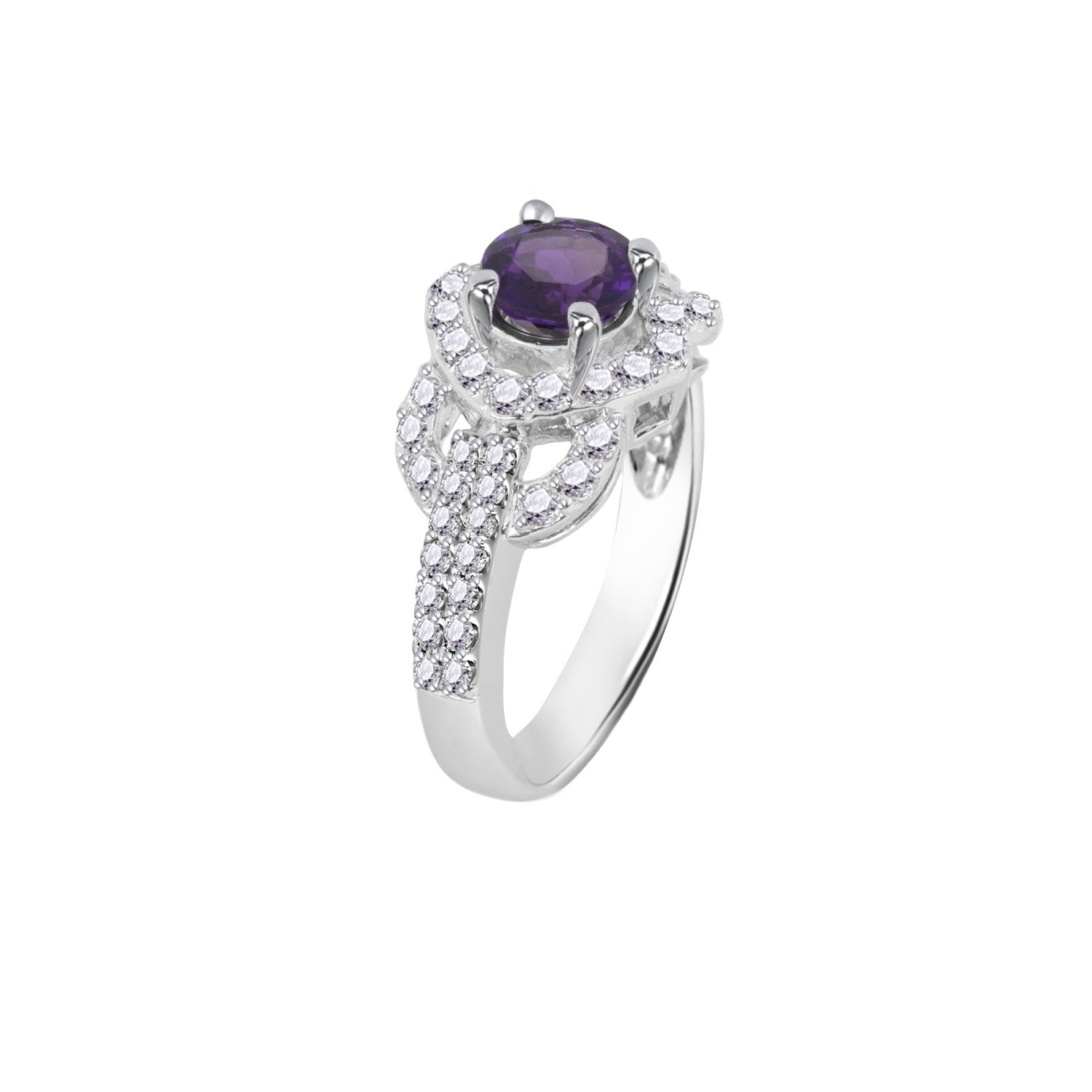 Round-cut deep purple gemstone, an amethyst, held securely in a four-prong setting. The center piece is surrounded by a flowing design of small round diamonds, creating a graceful, leaf-like pattern that extends down the shoulders of the band. The band is crafted from a lustrous white gold and features pavé-set stones along the upper shank for added brilliance. The design combines feminine elegance and artistic curves, making it a sophisticated statement piece perfect for both special occasions and everyday luxury.